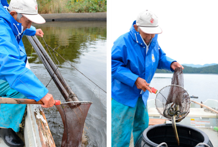 Suigetsu Lake and Suga Lake are well-known habitats for a tasty Japanese delicacy: eels. Usually, eels live in fresh water, but uniquely, these lakes have a mixture of fresh and salt water, which has a surprising effect on the eels; these conditions produce eels that not only taste better, but are also less smelly when cooked! Fishermen use a traditional method of catching them; they place bamboo tubes down into the water to trap the eels, because they know that eels like to hang out in narrow spaces. Since fish hooks are not used in this method, there is less chance of the eels being damaged when they are caught. If small eels get trapped, they can easily be released back into the water, to help sustain the eel population.