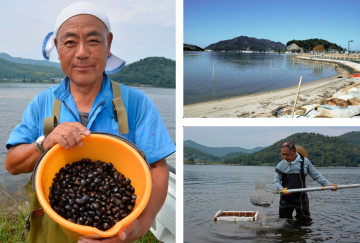 久々子湖では夏の終わりから秋にかけてシジミが捕れる。漁師たちは胸まで湖に入って、熊手の先にカゴをつけた特注の漁具で湖の底をひっかくようにシジミを捕る。三方五湖の湖畔にある縄文時代(紀元前5~3世紀ごろ)の遺跡からシジミの貝殻が数多く出土している。この地では、太古から人々の暮らしとシジミは密接に関わってきた。