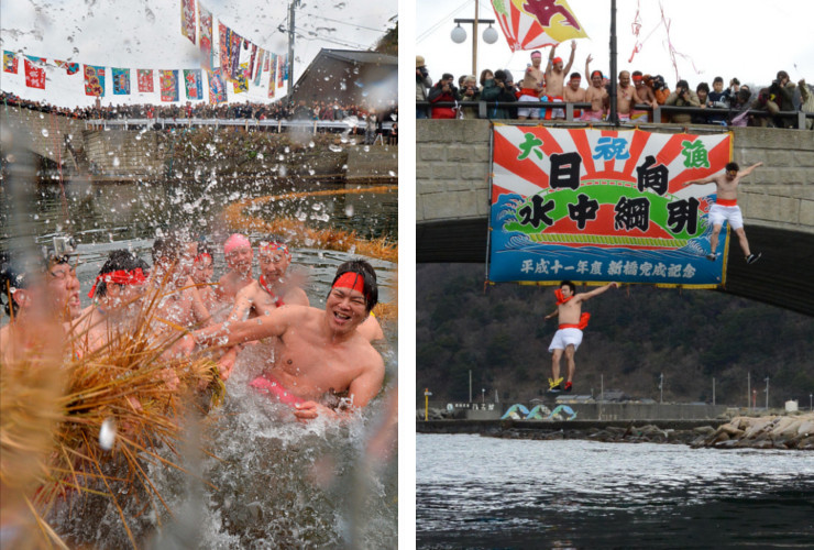 唯一、海とつながる日向湖では、約380年前から続いている伝統行事「水中綱引き」が、今も受け継がれている。毎年1月中旬、湖と湾をつなぐ冷たい運河に地域の男たちが橋の上から飛び込み、わらで編んだ太い綱を水中で引きちぎる勇壮な祭だ。その昔、湖に現れた大蛇を退治するための大きな綱を張ったことにゆかりがあるとも言われ、1年間の豊漁と家族の無事を祈る地域で1番大切な行事となっている。