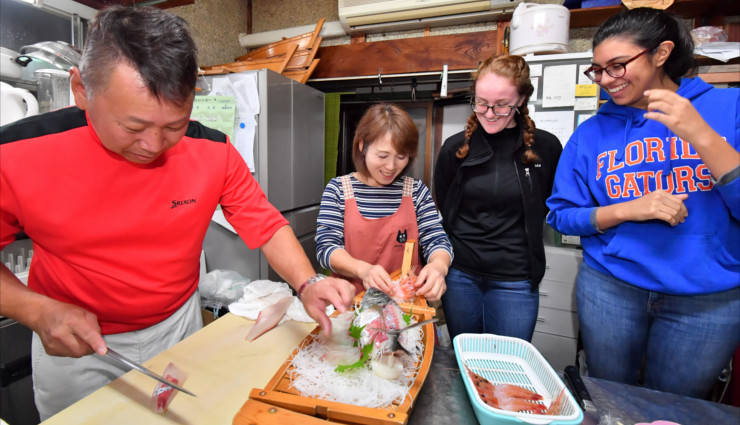 When the two visitors returned to “Takenaka,” the fisherman was waiting for them with hot bath. After breakfast, she taught them how to make dried fish “Himono”. She showed them the process of cleaning the fish that her husband just caught. They had enjoyed sashimi: raw fish and squid at the dinner on the previous night. They also loved the taste of “Himono” which was lightly grilled for breakfast that morning.