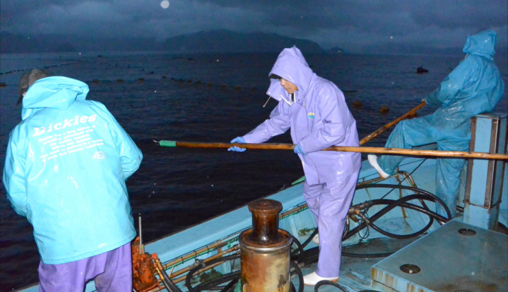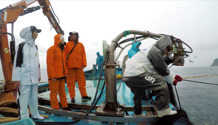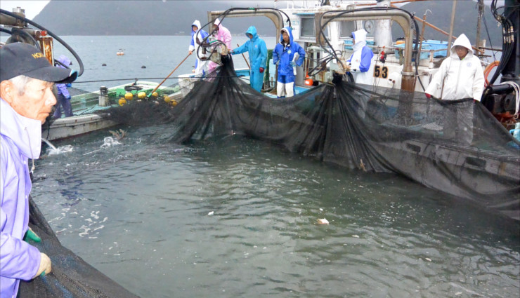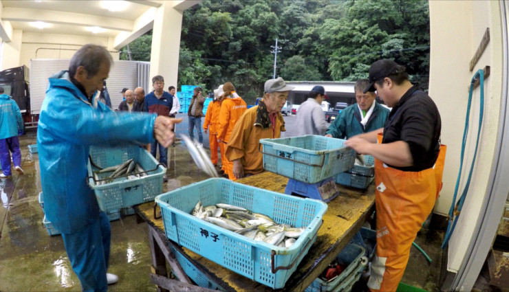 漁師たちの朝は早い。民宿「竹中(Takenaka)」に泊まった2人は午前5時50分、合図のサイレンとともに出航する民宿主人の漁船に乗り込んだ。白波を立てて定置網に向かう漁船から、入り組んだ海岸線がかすんで見える。網が仕掛けられた場所までは10分もかからない。二つの船に分かれた主人や仲間の漁師たちが黙々と網を引き上げていくと、浮かんできた魚群が水しぶきを上げた。この「大敷網漁(おおしきあみりょう)」と呼ばれる定置網漁は古来から伝わる伝統的な手法で、海の生態系を壊さない持続可能な漁法として知られている。
