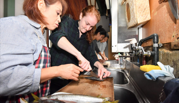 民宿「竹中」に戻ると、民宿主人の妻が「体冷えたでしょ」と2人に朝風呂を用意して待っていてくれた。妻は朝食後、取れた魚をさばいて干物(Himono)にする方法を教えてくれた。干物は魚の内蔵を取り除いて太陽の光や風にさらして乾燥させた伝統的な保存食だ。2人は昨晩の夕食で振る舞われた新鮮な魚やイカの刺し身に大変満足していたが、軽く焼いた干物の味もとても気に入っていた。