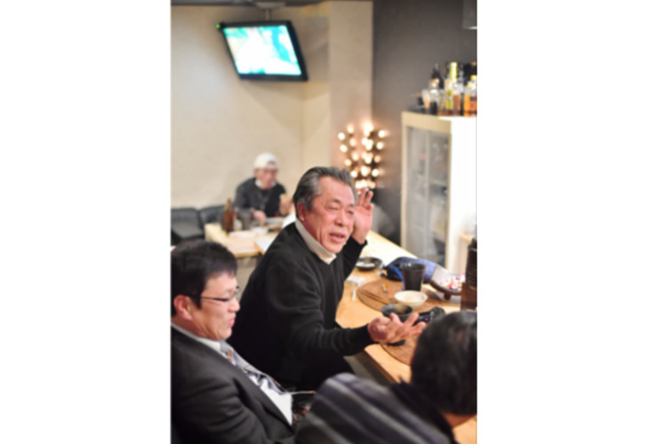 カウンターは男性客で満席になりました。昔ながらの仲間のように会話が盛り上がっていますが、なんと驚くことに全員が初対面だそうです。これも、人と人を結び付けるママの人柄がなせる技でしょう。お客の一人は「同世代が集まったらこんなもんですよ」と話し、意気投合した初対面の男性と一緒に、再び夜のまちへと繰り出していきました。