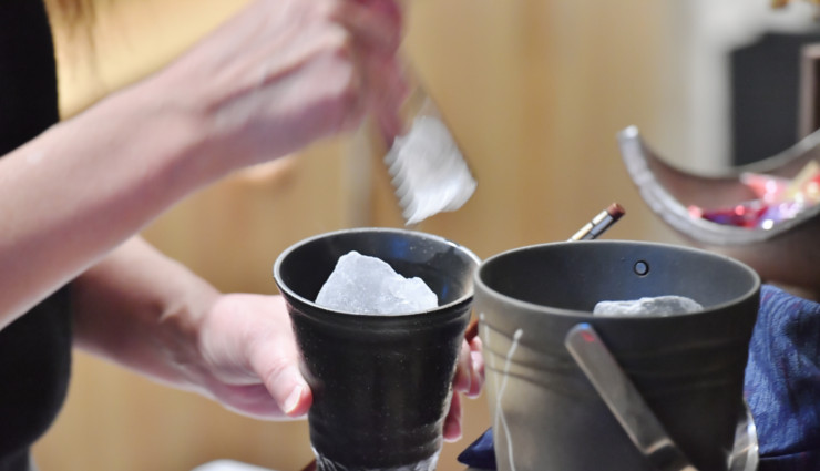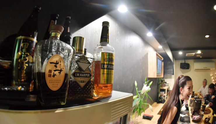 The lady who serves at a Sunakku is called “mama” by her customers. “Mama” serves her customers from behind the counter. “Mama” welcomes various people and listens to their complaints and love problems. So, it can be said that the main dish there is conversation with “mama,” besides the regular menu of alcoholic drinks such as whiskey, and shochu (a kind of Japanese vodka), and snacks such as peanuts and crackers. Repeating customers leave their bottles so that they can drink theirs the next time. The bottles are displayed on the shelf behind “mama” at the counter.