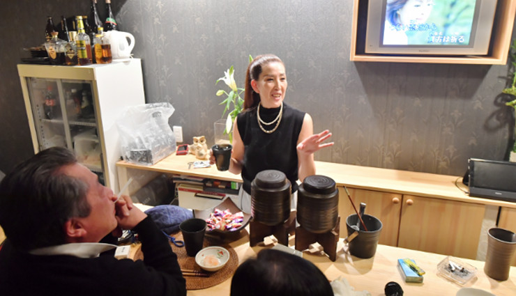 Now, you find yourself in Sunakku “Sara.” “Sara” is located on the third floor of a building in Katamachi. Masayo Kobayashi, serving the role of “mama” for 35 years, runs this Sunakku all by herself. She named her Sunakku “Sara” simply because the previous bar in the same space used the name. Now, it is about 9 pm. Today, as usual, people who want to enjoy conversations with “mama” enter “Sara” after having dinner at Japanese tapas bars, Yakitori (grilled chicken) bars, and so on.