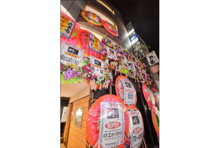 A good number of “Hanawa,” which make the views of Katamachi impressive to visitors, give you visible evidence that Sunakku are loved by people in the community. Hanawa, giant flower garlands, are displayed with messages hung down to celebrate newly opened Sunakku, clubs, and so on. They are also displayed to celebrate the anniversaries of businesses. They are gifts from other shops or even from customers. Every shop displays such Hanawa as if they are competing to see which are the most loved by the community.