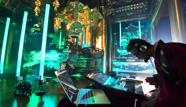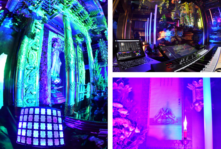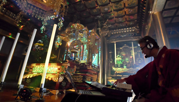 Gyosen produced his first Buddhist service in this innovative and creative style back in May 2016. He amazed worshippers by using 3D projection mapping to project video images on to the temple’s beautiful Buddha statue and interior walls, essentially turning his temple into something resembling a techno house. He attempted to express the nature of Buddhist life after death through techno. As the music played, the traditional interiors of his temple shone in various beautiful colors of lights. During the service, chants were made in the traditional way by Gyosen wearing a headset. An elderly lady, who had worshipped at the temple for many years, commented that she could imagine that the world after death could be something like what she saw in Gyosen’s new style of service that day.