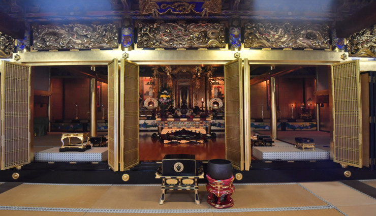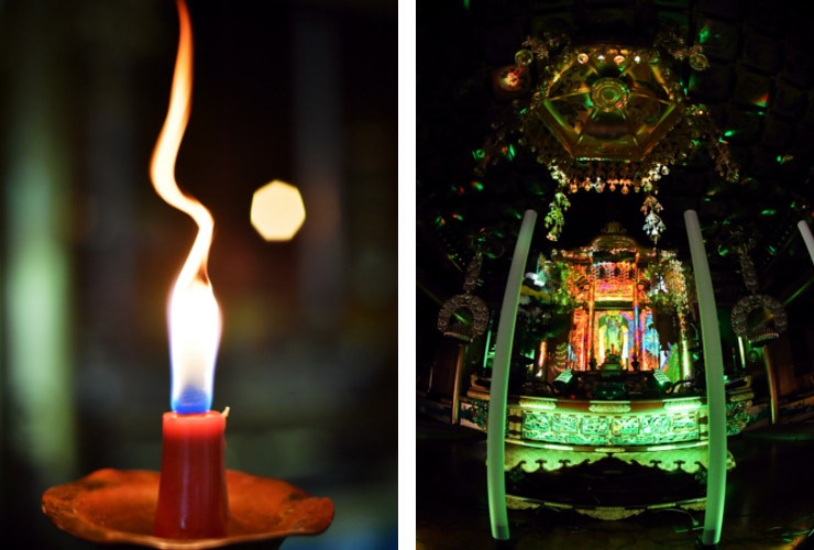 Gyosen sees the traditional gold interiors and sculptures such as phoenix and lotus flowers carved on the pillars and beams of the temple are one way of expressing Buddhist life after death that the people in the past created as their best forms of art. Now he thinks it is his turn in the 21st century to use his techno style service as another way of expressing Buddhist life after death. Gyosen plans to have his third techno style service in May 2017 and has raised 300,000 yen through crowd funding to pay for lighting equipment.