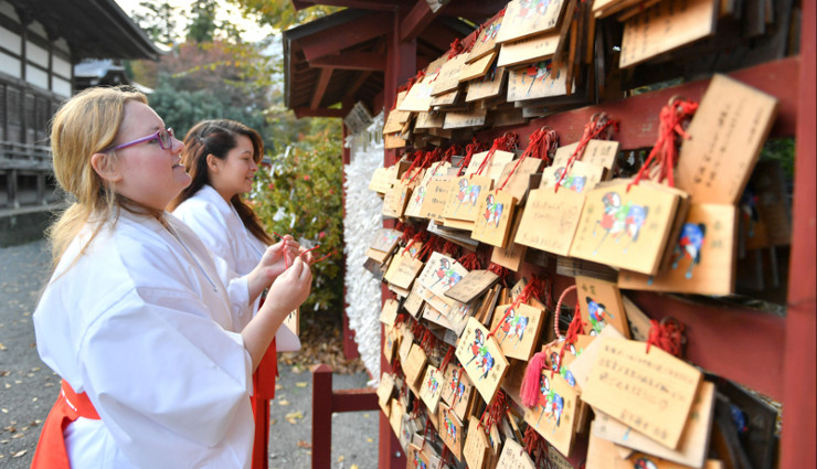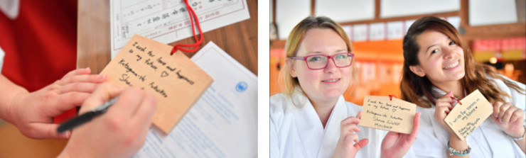 木の板でできた「絵馬」は、神様への願い事を届けるために使われます。参拝に訪れた人がそれぞれの願いを書いて、境内に飾ります。その意味を教わった2人は、心を込めて丁寧に願い事をつづりました。「私の将来に愛と幸せが訪れますように」。そのときの2人は、日本人の精神性に触れる特別な体験にとても満足そうでした。