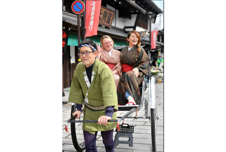 着物を着た2人は、街角で待ち受けていた人力車に乗って散策に出発しました。ボランティアグループ「越前こぶし組」の車夫が人力車を引っ張りながら、まちの歴史についての話を聞かせてくれます。車夫の道鎮郁生(どうちん・いくお)さんは身ぶり手ぶりでお客の2人に大野の魅力を伝え、笑いを誘っていました。