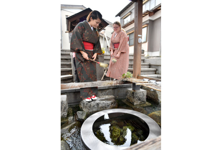 篠座神社は717年、白山を開山した泰澄大師によって建立されました。ここでは、巫女の衣装に着替えて、神社参拝の正しい作法を体験することができます。手水の掛け方、参道の歩き方など、境内に入ってから拝殿でお参りをするまでの流れを、神職の猪島丈意(いのしま・たけおき)さんが教えてくれます。鳥居やしめ縄に込められた意味についても、丁寧に伝えてくれました。