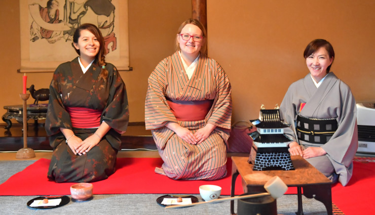 First, they walked around the traditional part of the town in kimono. “Kaseya” is a kimono shop where tourists can rent and be dressed in a kimono of their choice. They can choose and wear a kimono and an obi belt. Ms. Chieko Urata, the owner of the shop, gives the visitors a talk about Japanese mentality and teaches them how to sit and move wearing a kimono.