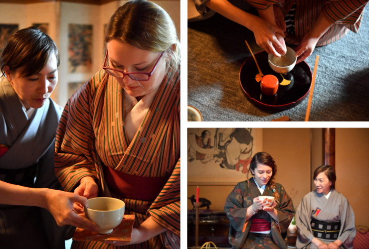 名水を釜で沸かして入れた抹茶の味は格別です。2人は格式ある旅館でぜいたくなひとときを過ごし、茶道の細やかな作法に感心していました。着物姿で彼女たちを迎え入れた筒井さんは「来てくれた人に安らぎを感じてほしい」と、次の来客を心待ちにしている様子でした。