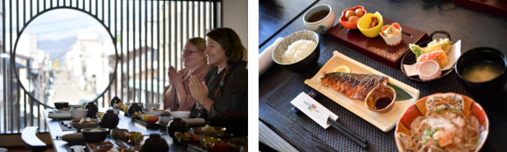 2人が昼食を楽しんだのは、五番商店街の鮮魚店が営むカフェ「うおまさカフェ」。「大野膳」のメイン料理は焼きサバで、夏至から11日目の半夏生の日に丸焼きのサバを食べて疲れを癒やす習慣があることに由来しています。このほかにも、マイタケやおろしそばなど地元の食材を使った料理をたっぷりと堪能しました。